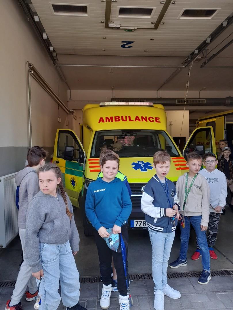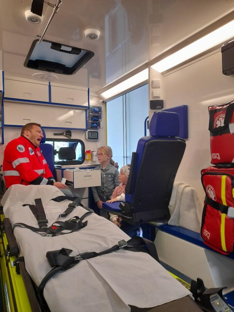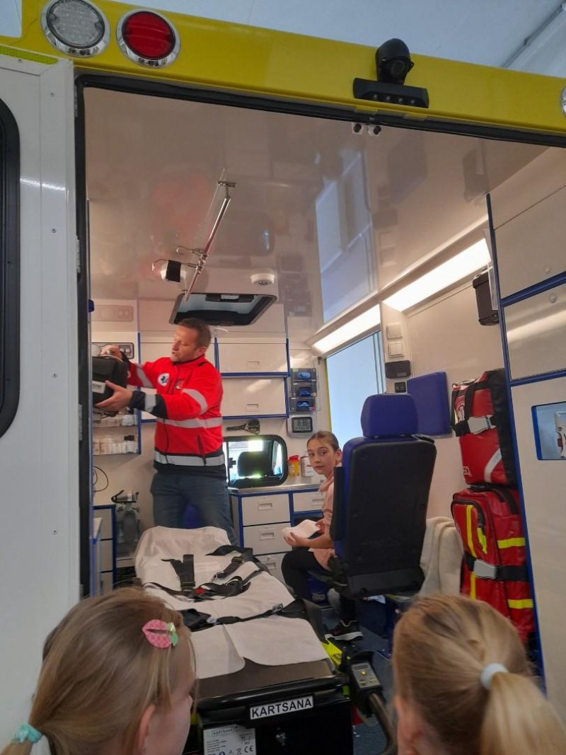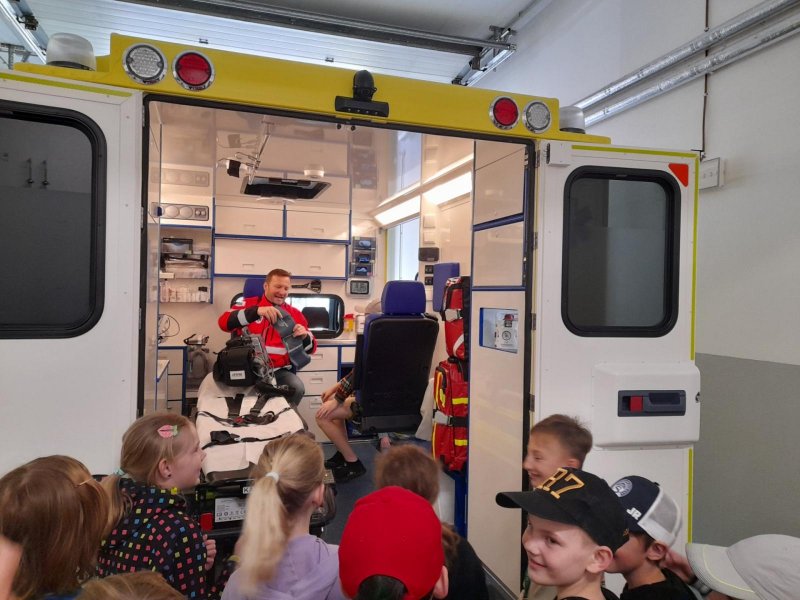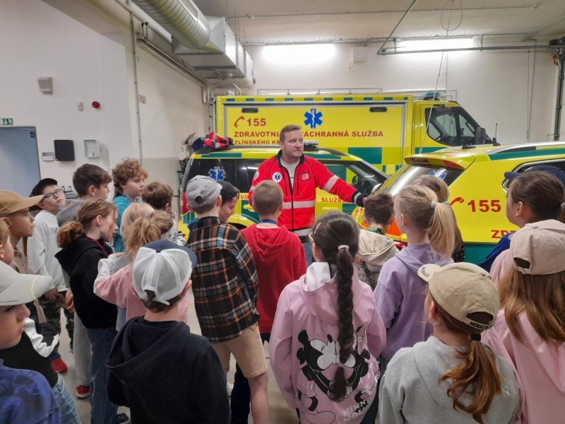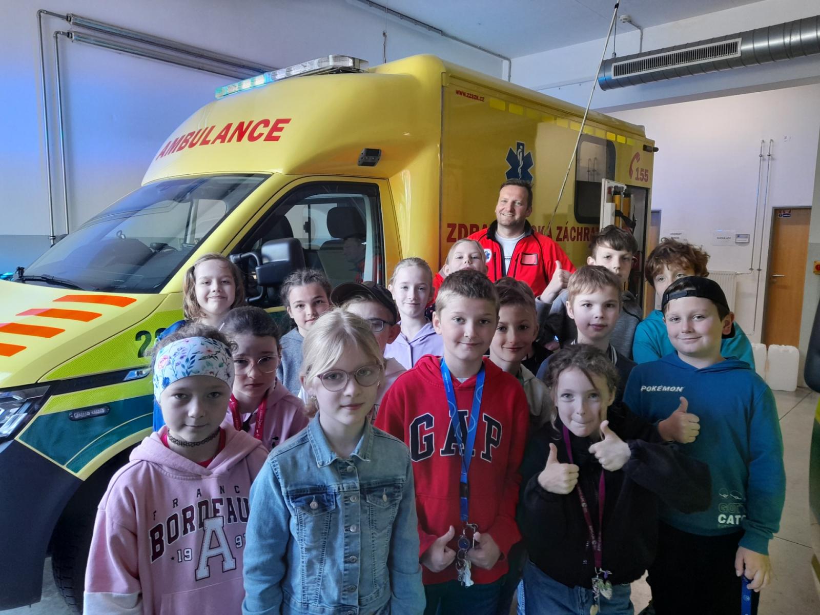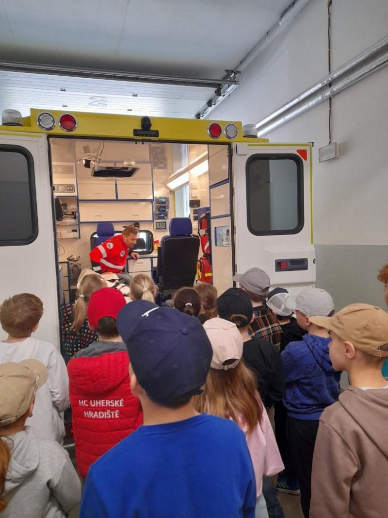 Přivítal nás milý záchranář, pan Jiří Vašica, také absolvent naší školy. Představil nám vybavení a přístroje, které zachraňují lidské životy. Sami jsme si vyzkoušeli roli pacienta, kdy nám měřil puls, EKG či nás transportoval na nosítkách.