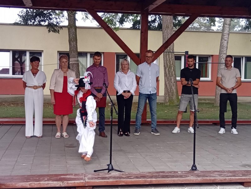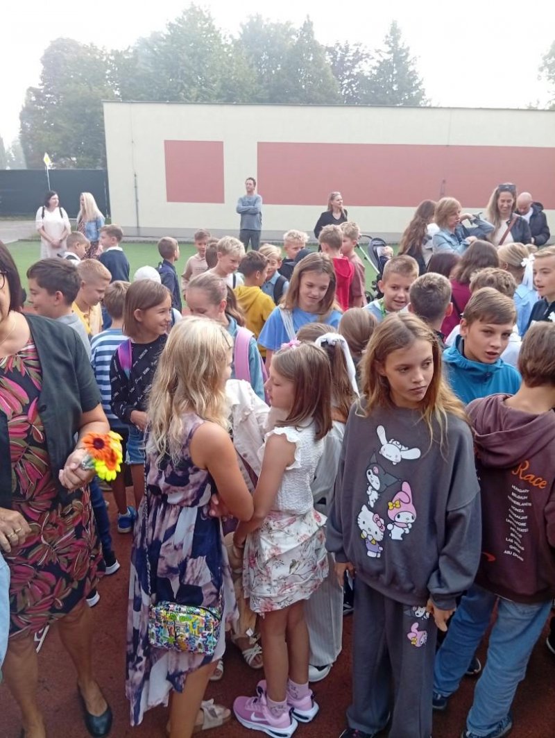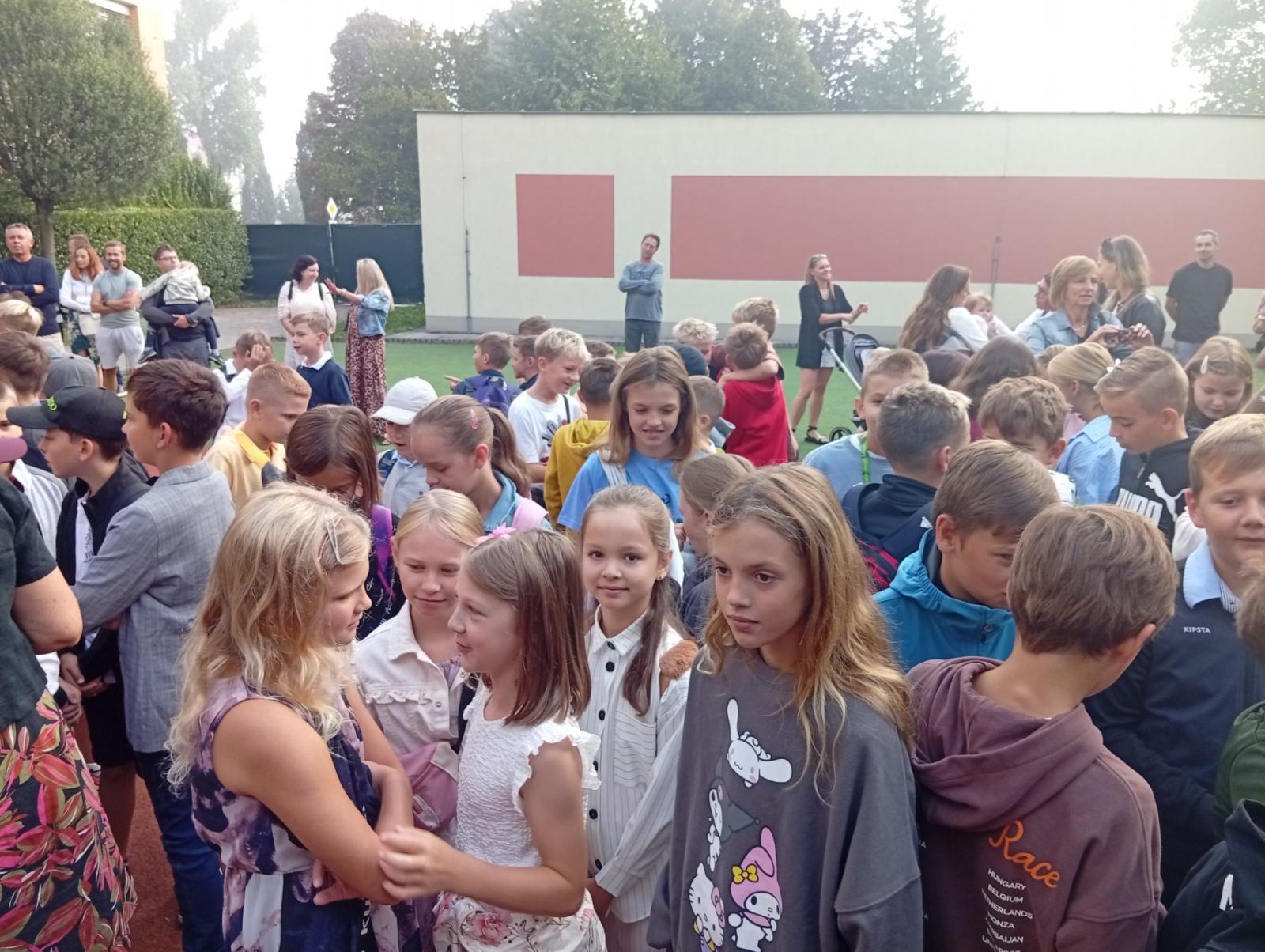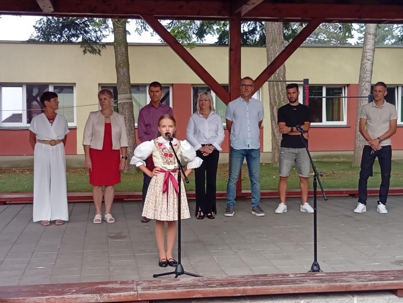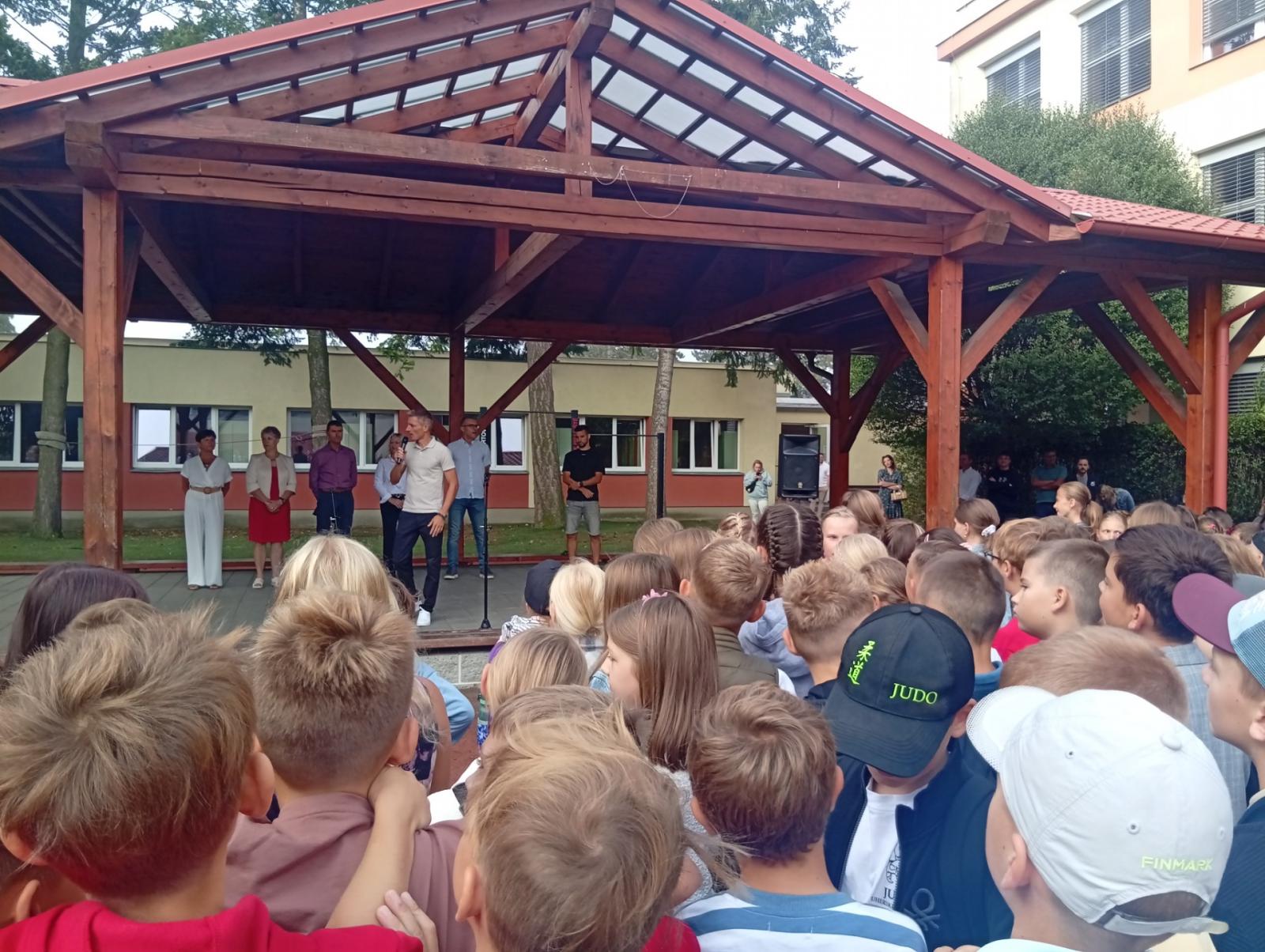V atriu proběhlo tradičně zahájení nového školního roku, kde nás přivítal pan ředitel a také například trenér FC Slovácka pan Honza Kameník.