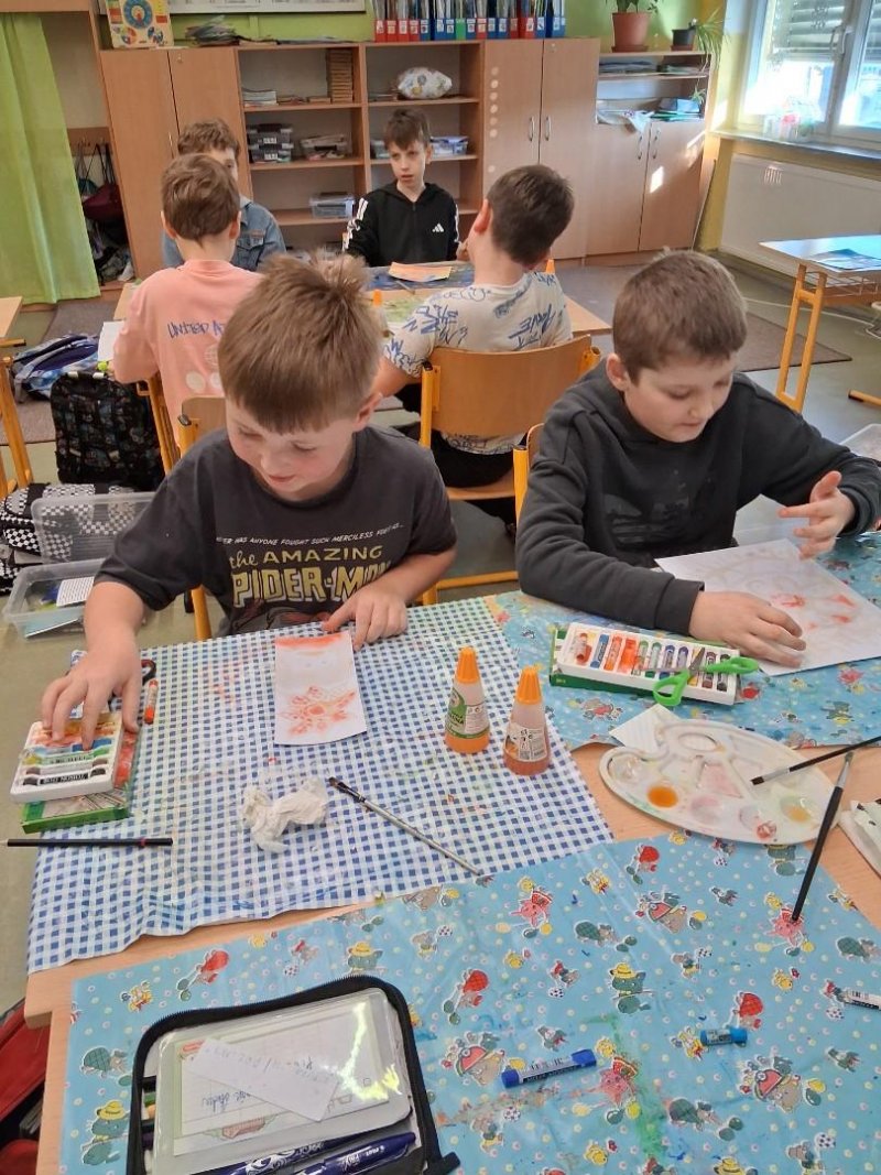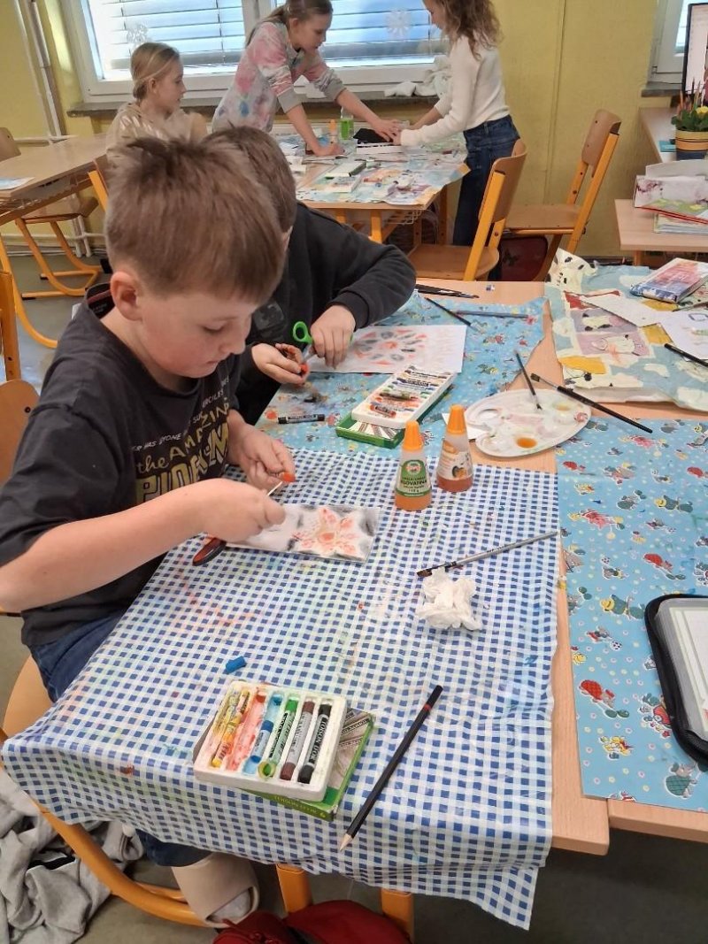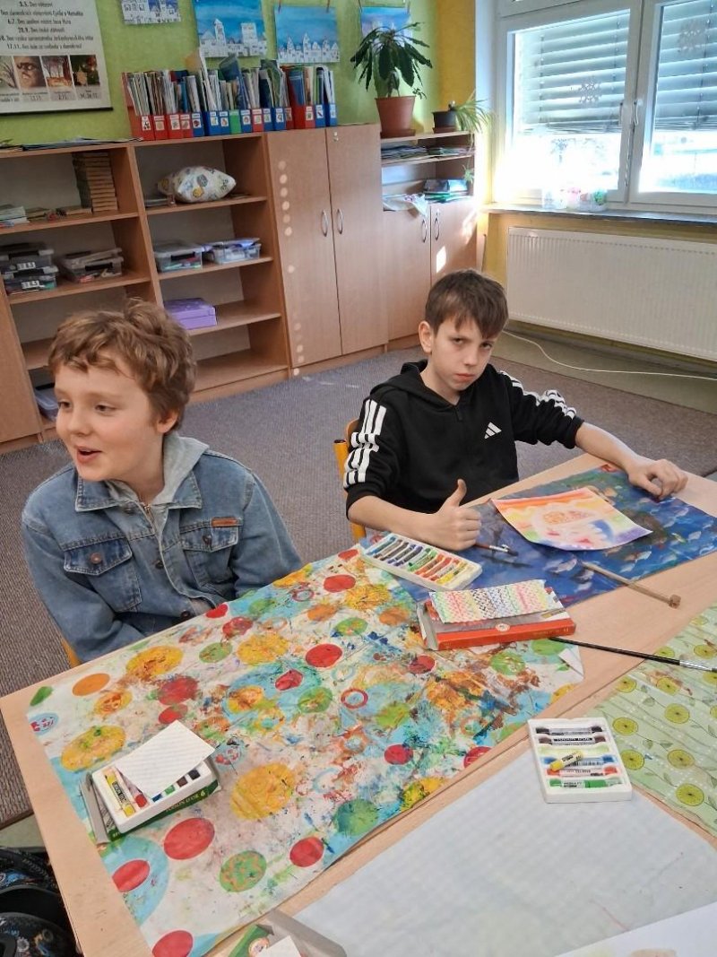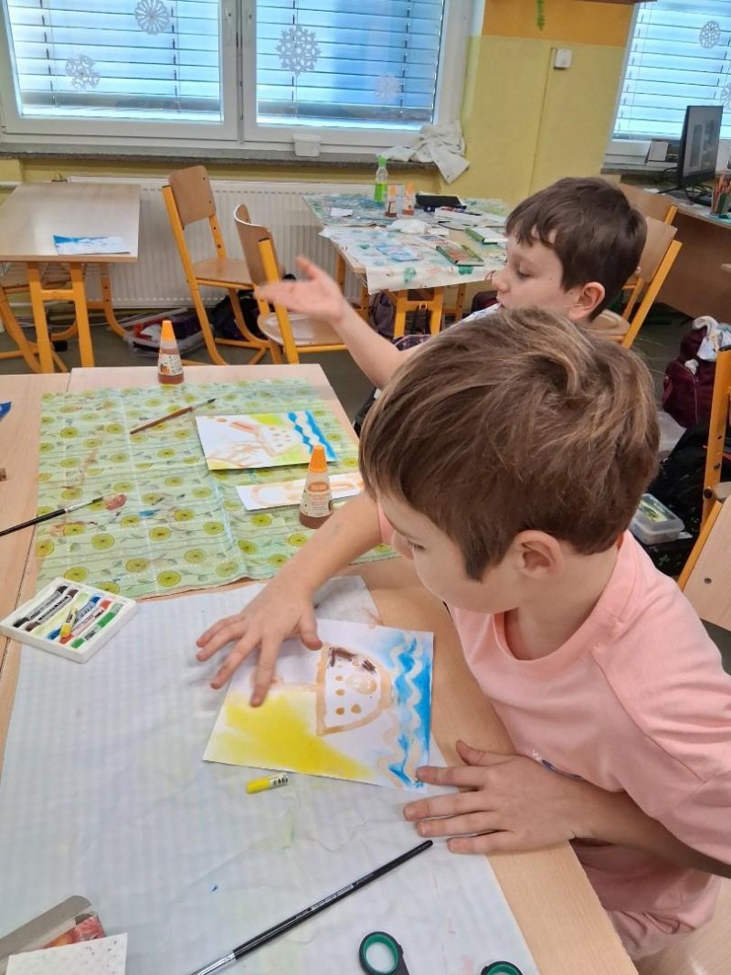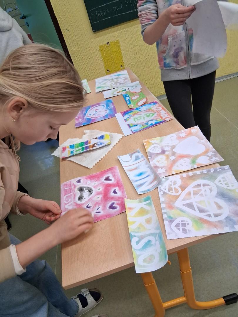 Ve výtvarce jsme si vyzkoušeli namalovat obrázek klovatinou a po zaschnutí vybarvit suchým pastelem - křídou. Poté klovatinu vymýt pod tekoucí vodou. Až na to čekání, než klovatina zaschne to byla zábava. A výsledek? Posuďte sami.