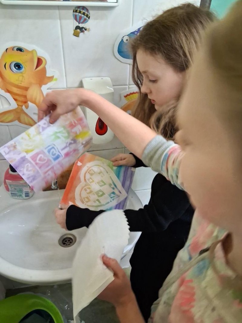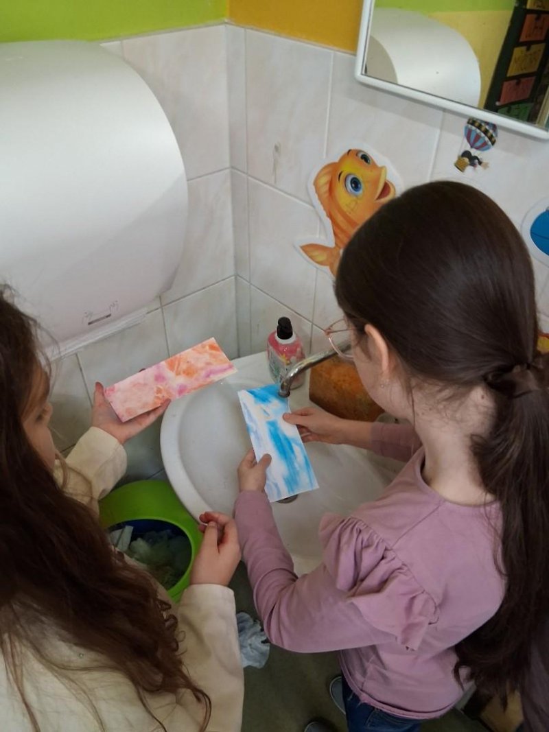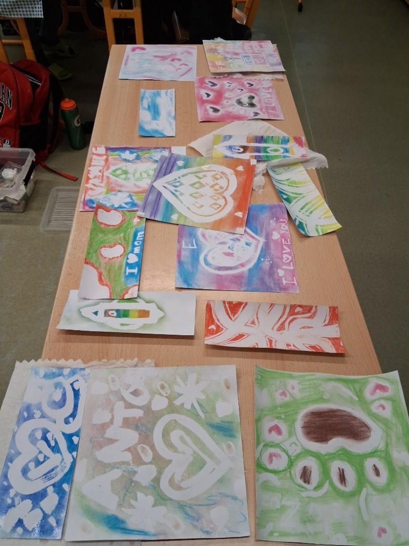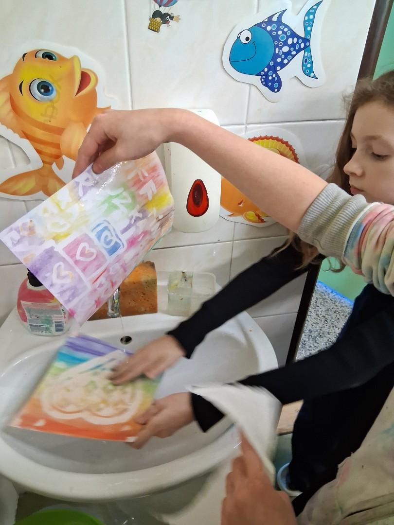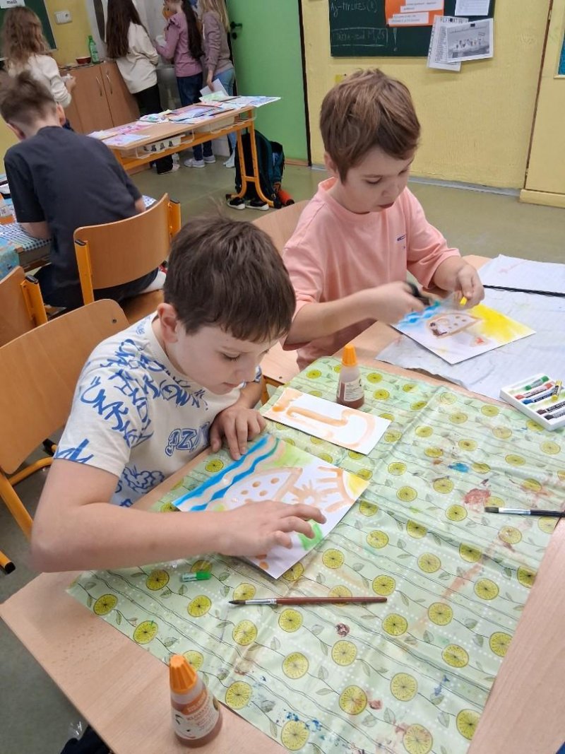 Ve výtvarce jsme si vyzkoušeli namalovat obrázek klovatinou a po zaschnutí vybarvit suchým pastelem - křídou. Poté klovatinu vymýt pod tekoucí vodou. Až na to čekání, než klovatina zaschne to byla zábava. A výsledek? Posuďte sami.
