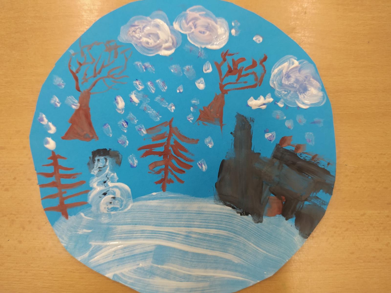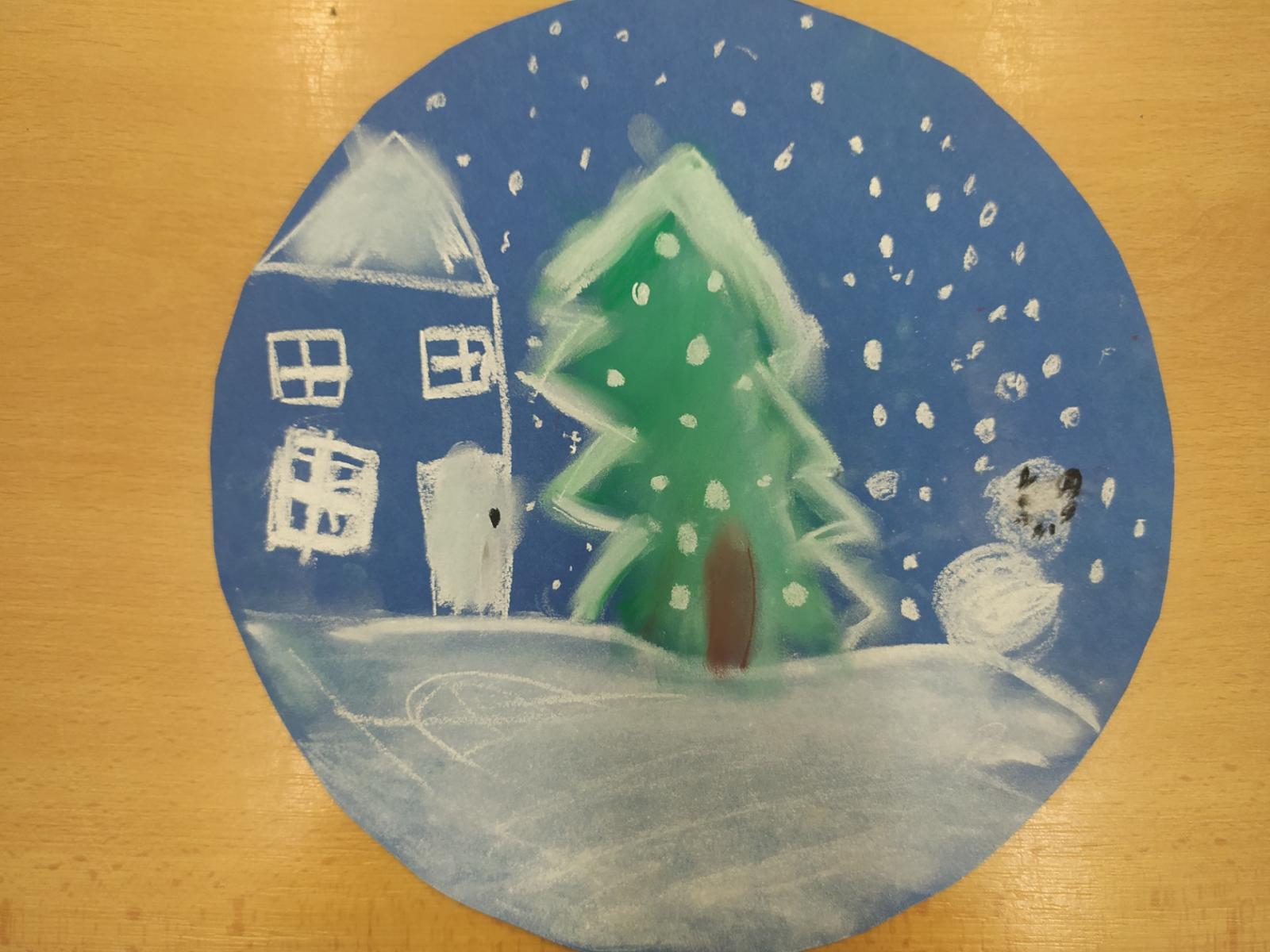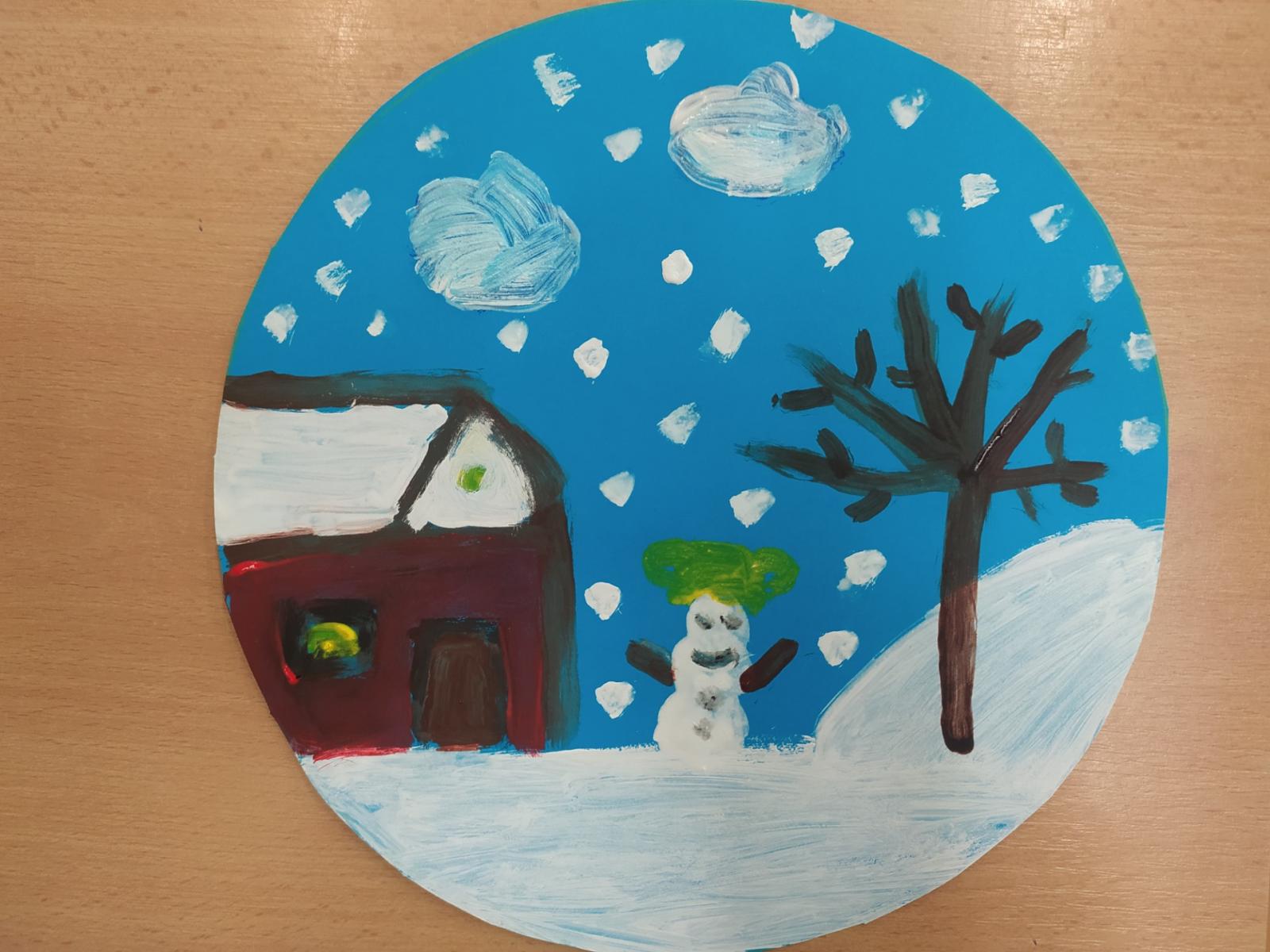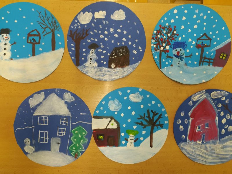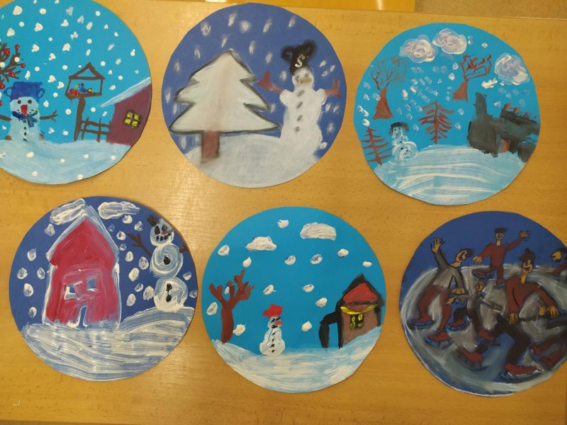 Krásné zimní obrázky nám vyzdobí třídu. Zvolili jsme volnou techniku, to znamená, že si každý mohl vybrat, co použije ke své práci. Někdo chtěl temperové barvy, jiní zase rozmazky, Martin zase lepil, ale práce se moc povedla všem.