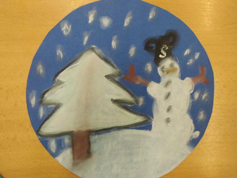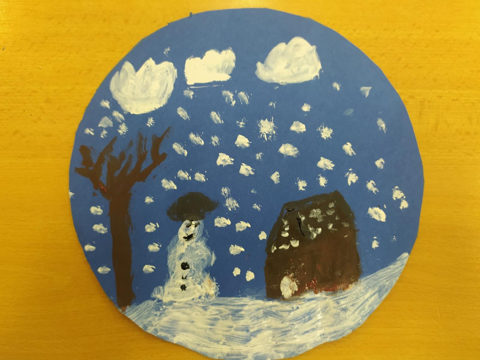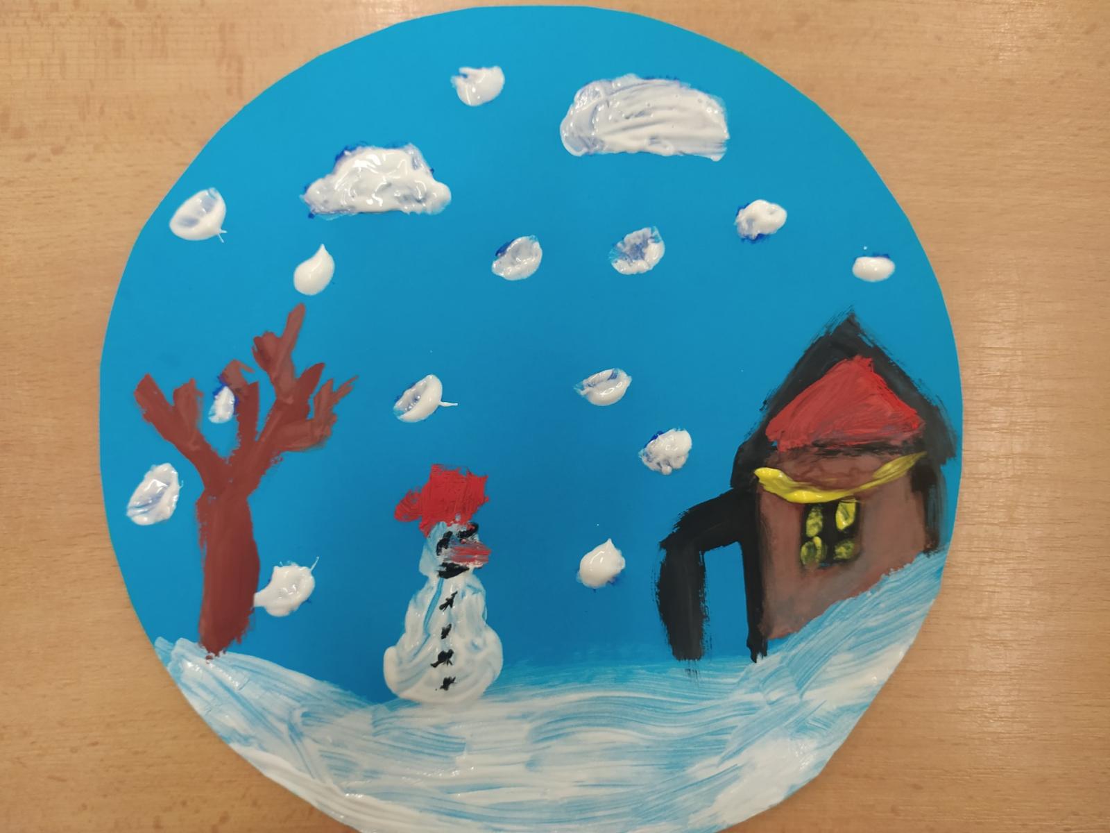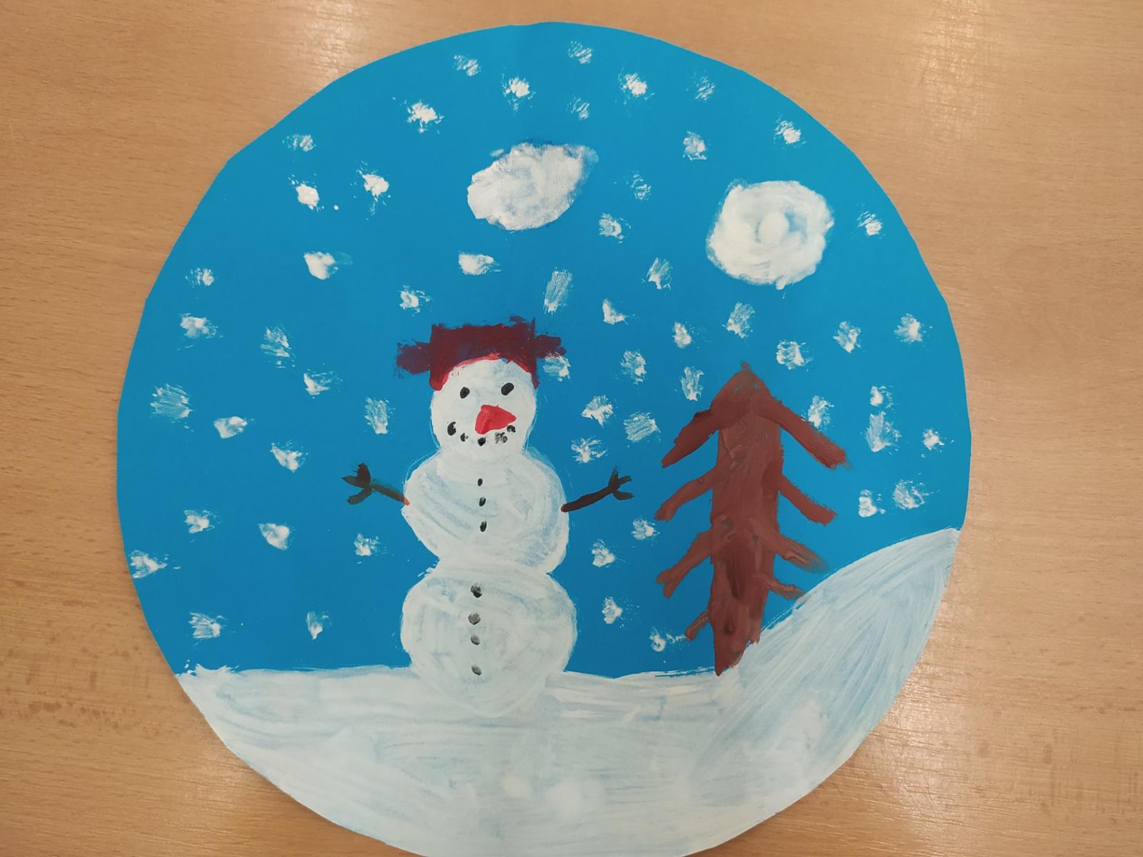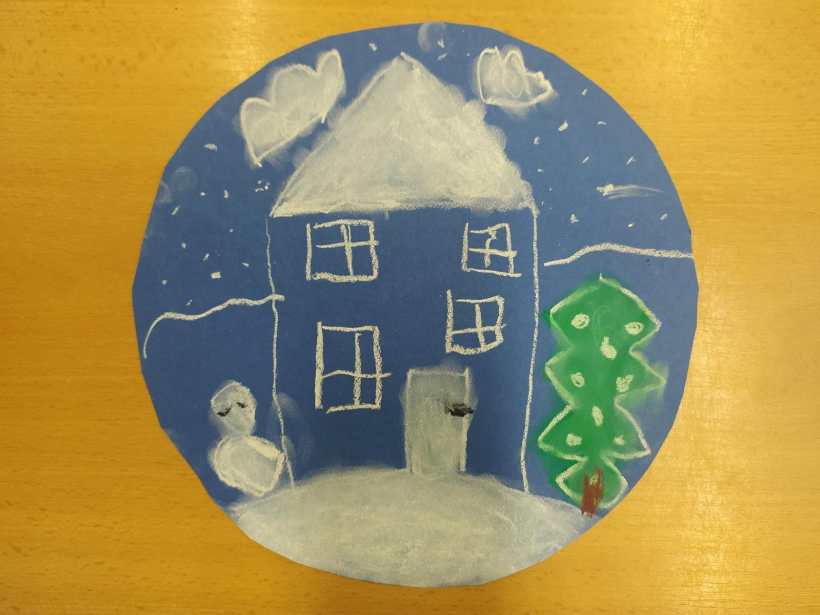 Krásné zimní obrázky nám vyzdobí třídu. Zvolili jsme volnou techniku, to znamená, že si každý mohl vybrat, co použije ke své práci. Někdo chtěl temperové barvy, jiní zase rozmazky, Martin zase lepil, ale práce se moc povedla všem.